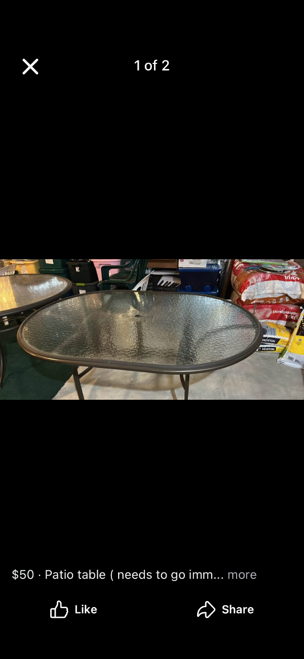 An oval shaped patio table .metal frame glass top and sa small cut on the top , While moving homes . 50 inch Lx42 inch wide x 27 inch height